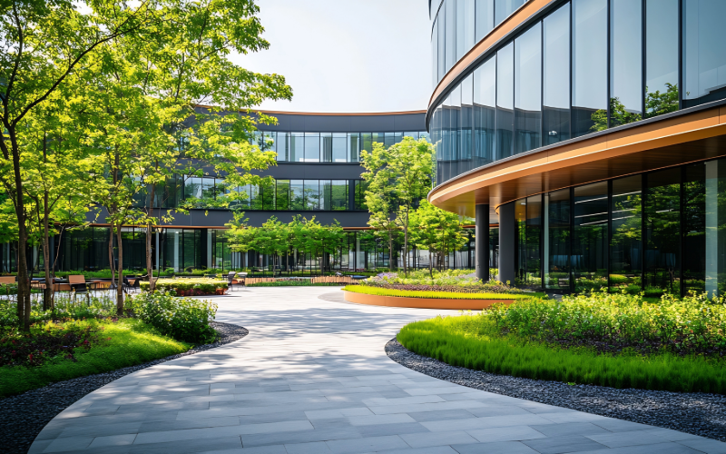 Los caminos arbolados o jardineras perimetrales no solo son estéticos, también permiten al personal caminar, estirarse y despejarse durante la jornada laboral.